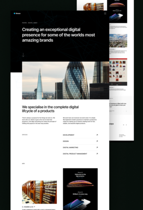 Design agency trendy website in minimalism style. Includes text blocks, links, examples of work. A modern concept in black and white.