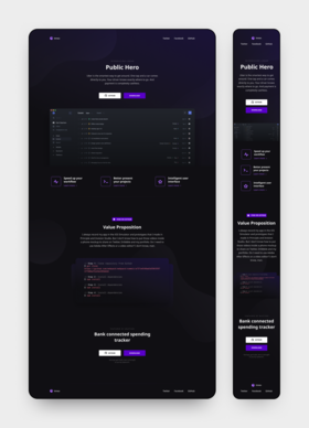 Dark interface for landing pages with purple elements. Hero section, footer, header, text block, main and secondary buttons at one amazing template, Webpage business concept theme.